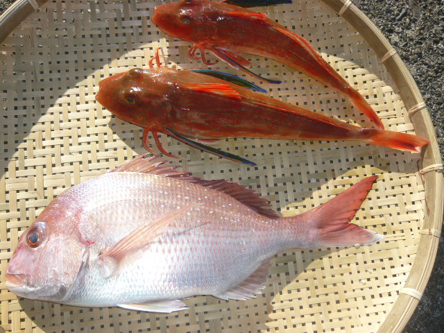 | 名称 | 真鯛、ホウボウ ☆徳永氏 タイラバ釣り | サイズ | 45㎝、34㎝、40㎝ | 重量 | 1.2㎏ |