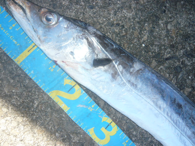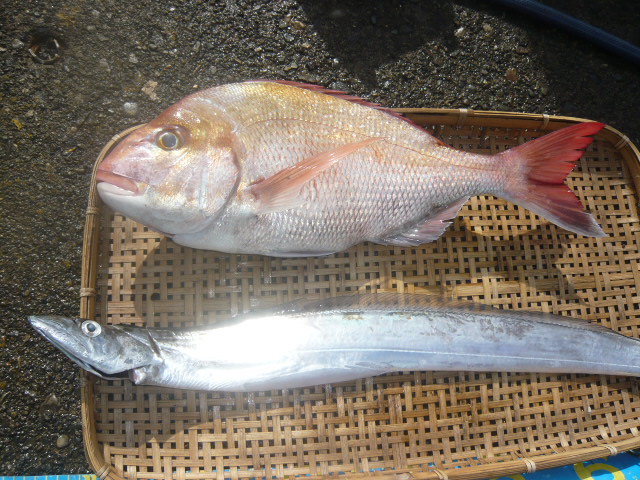 | 出ました~! ・マアジ 20~35㎝ 良い人50匹 ・大アジ 30~40㎝ 8匹 ・マダイ 2㎏ 55㎝ ☆にく氏 ・タチウオ 100㎝ 1本 ・タチウオ 80~90㎝ 良い人4本 他 カマス、カサゴ ※穏やかな一日、タチウオは、バラシが多く。 サワラ、手もとで・・・ポチャン 残念! |