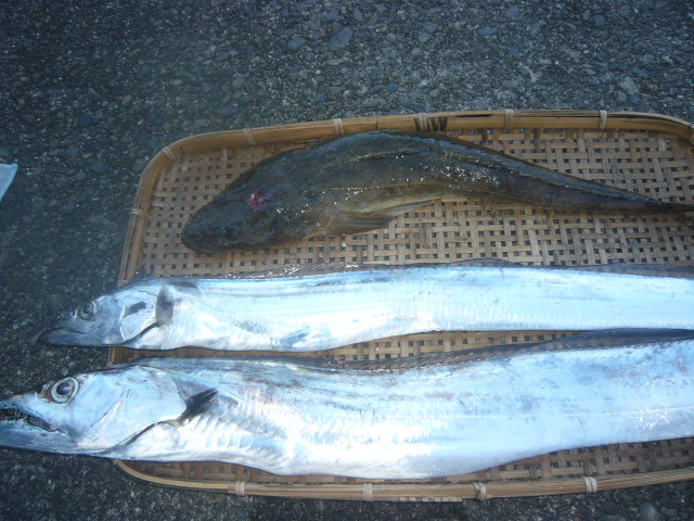 | 昼から本降り止んでは降りのち晴れ! ※ タチウオ 80、80,108㎝ 116㎝ 6本指 泳がせ釣り。 マゴチ 58㎝ タチウオは、ドラゴン級が 出始めています。 |