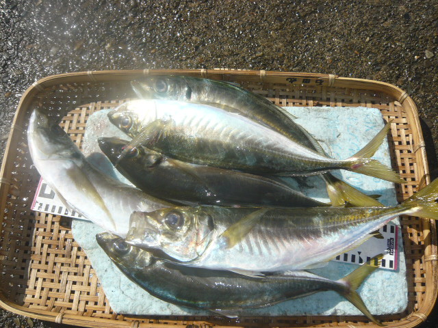 | ひるから本降り止んでは降りのち晴れ! ※ マアジ ・小~大アジ 青山看板沖 ・大アジ がれば根 ・中~大アジ 富士山根 ・中アジ 武山根 |