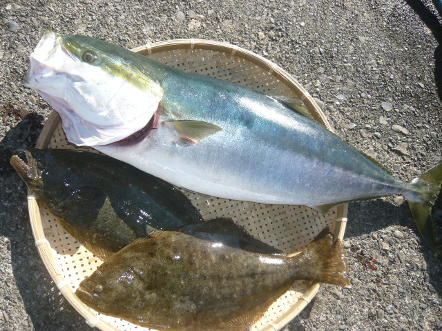 | 出ました~ブリ!! ・マアジ 20~30㎝ 50匹 ・ブ リ 6.2㎏ 90㎝ ☆古旗氏 ・ヒラメ 1㎏ 47㎝、 1.1㎏ 48㎝ 他 カサゴ ※ 立派なブリに、ヒラメが2匹! 泳がせ釣り、他にも当たりはあったのですが・・・残念。 6㎏以上が、ブリです。 |