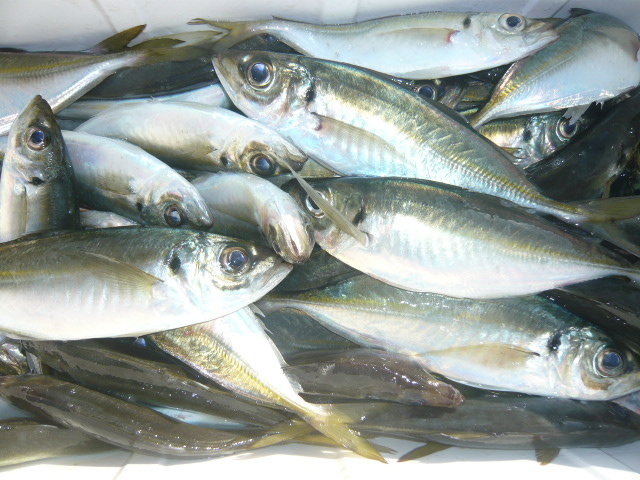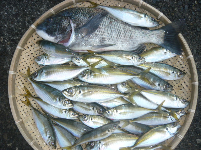 | 穏やかな一日でした。 ・マアジ 20~26㎝ 74匹 ・クロダイ 46㎝、45㎝、41㎝ ※ アジ、中根周辺でした。 ポイントにより、小ぶりが多く。 泳がせ釣り、当たりはありませんでした。 |