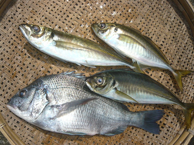 | 穏やかな一日。 ・マアジ 25~42㎝ 7匹 ・大アジ 38~41㎝ 5匹 ・マダイ 31㎝ 他 カサゴ、イシモチ ※ アジは、富士山根、富士山根沖側東より。 タチウオは、不調でした。 |