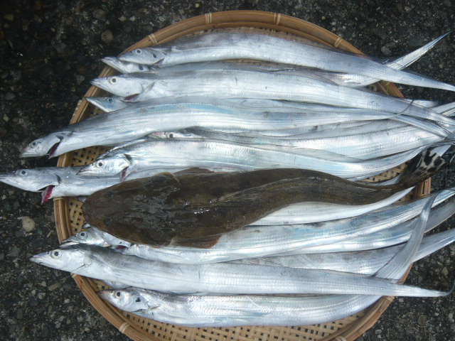 | 出ました~!! ・マアジ 20~37㎝ 30匹 ・ヒラメ 3.4㎏ 72㎝ ☆佐々木氏 ・タチウオ 124㎝ ☆佐々木氏 ・マゴチ 40㎝位 2匹 他 大アジ、イナダ、カサゴ ※ Bigヒラメ! ドラゴン! 泳がせ釣り 南西風が多少吹いていました。 ※ ザル、直径 60㎝。 |
